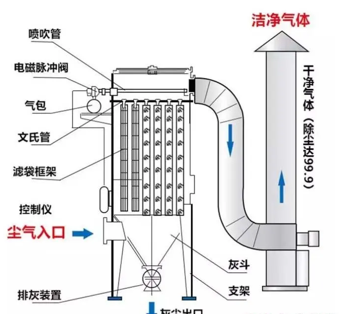 含塵氣體由風(fēng)機通過吸塵管吸入箱體,進入濾袋過濾,粉塵顆粒被濾袋阻留在表面,經(jīng)過過濾的凈化氣體由出風(fēng)口排出,可直接排放在室內(nèi)循環(huán)使用,也可根據(jù)需要排出室外。整個除塵過濾是一個重力,慣性力,碰撞,靜電吸附,篩濾等綜合效應(yīng)的結(jié)果。除塵器連續(xù)工作一段時間后,濾袋表面的粉塵不斷增加,繼而進行清灰,粉塵抖落在集塵器(抽屜)中,再由人工進行處理 。