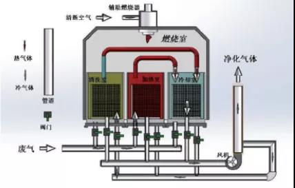 RTO把有機(jī)廢氣加熱到760攝氏度以上,使廢氣中的VOCs在氧化分解成二氧化碳和水。氧化產(chǎn)生的高溫氣體流經(jīng)特制的陶瓷蓄熱體,使陶瓷體升溫而蓄熱”,蓄熱用于預(yù)熱后續(xù)進(jìn)入的有機(jī)廢氣,從而節(jié)省廢氣升溫的燃料消耗。陶瓷蓄熱體應(yīng)分成三個(含三個)以上的區(qū)或室,每個蓄熱室依次經(jīng)歷蓄熱-放熱-清掃等程序,周而復(fù)始,連續(xù)工作。蓄熱室放熱后應(yīng)立即引入部分已處理合格的潔凈排氣對該蓄熱室進(jìn)行清掃(以保證VOC去除率在99%以上),只有待清掃完成后才能進(jìn)入蓄熱程序。RTO蓄熱式廢氣處理設(shè)備,運(yùn)行費(fèi)用省,有機(jī)廢氣的處理效率高的優(yōu)點(diǎn),適應(yīng)廢氣濃度1000~10000mg/m3,分解效率:99%—99.5%。是目前較為經(jīng)濟(jì)可靠的達(dá)到50mg/m3嚴(yán)格的排放標(biāo)準(zhǔn)的VOCs治理技術(shù),得到了廣泛的應(yīng)用。