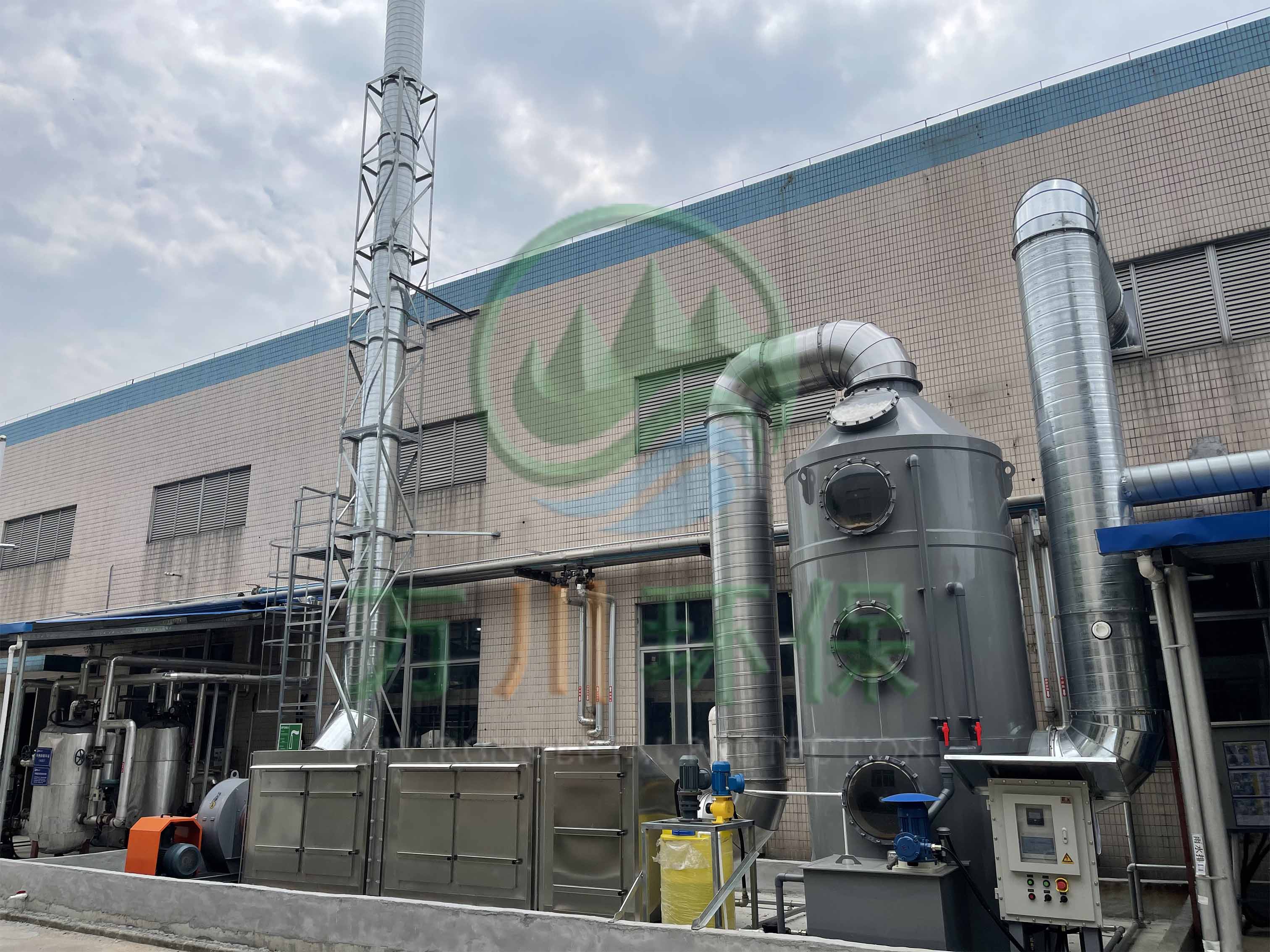 根據(jù)廢氣類型和場(chǎng)地需求我們采用噴淋塔+兩級(jí)活性炭對(duì)其進(jìn)行處理。反應(yīng)釜廢氣處理配套一臺(tái)17170風(fēng)量pp噴淋塔+兩臺(tái)17170風(fēng)量的不銹鋼材質(zhì)活性炭吸附塔+干式過濾與大功率防爆離心風(fēng)機(jī)+自動(dòng)化電控柜系統(tǒng)。