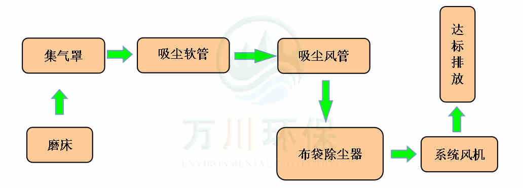磨床生產(chǎn)時產(chǎn)生的粉塵通過集氣罩、吸塵軟管進(jìn)入到脈沖布袋除塵器中過濾凈化,粉塵落入灰斗,凈化后的廢氣通過系統(tǒng)風(fēng)機(jī)達(dá)標(biāo)排放。