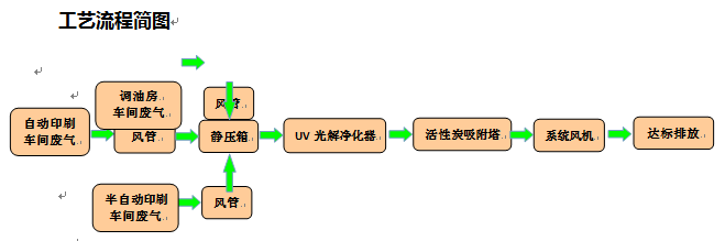 因為該企業(yè)印刷機車間均為密閉車間,且已做排風系統(tǒng),但排風系統(tǒng)和小風機均為直排到高空和廠房1樓外部,影響到了周圍環(huán)境。經過我司工程師現場勘查,結合企業(yè)的實際生產情況,我們最終決定采用UV光解法+活性炭吸附法來進行處理。